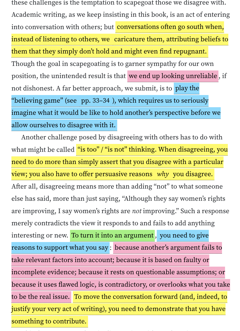 If there is one point that we hope you will take away from this book, it is the importance not only of expressing your ideas (“I say”) but also of presenting those ideas as a response to some other person or group (“they say”). p. 3